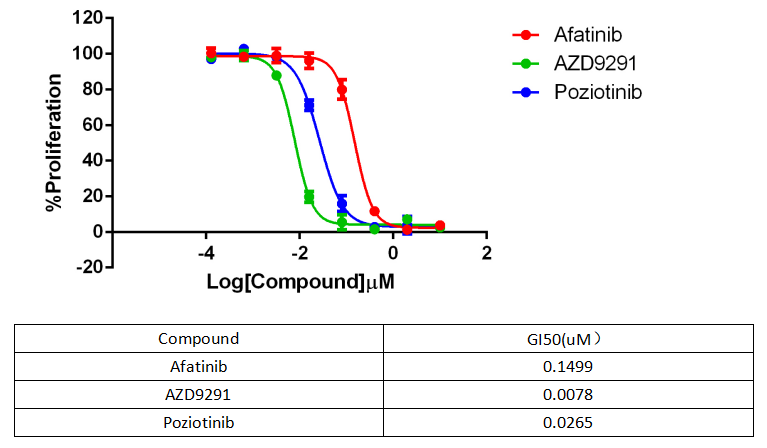 Figure 4. Anti-proliferation assay of three reference compounds on the EGFR Del19-T790M/BaF3 Stable Cell Line.