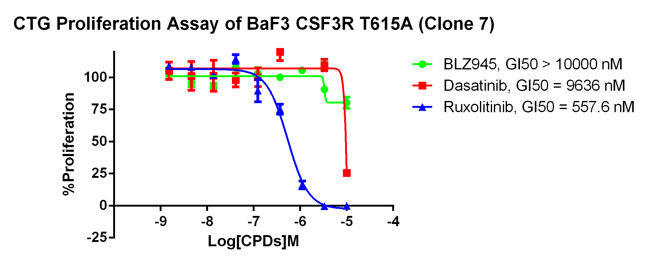 Figure 2. Anti-proliferation assay of three reference compounds on the CSF3R T615A/BaF3. |
