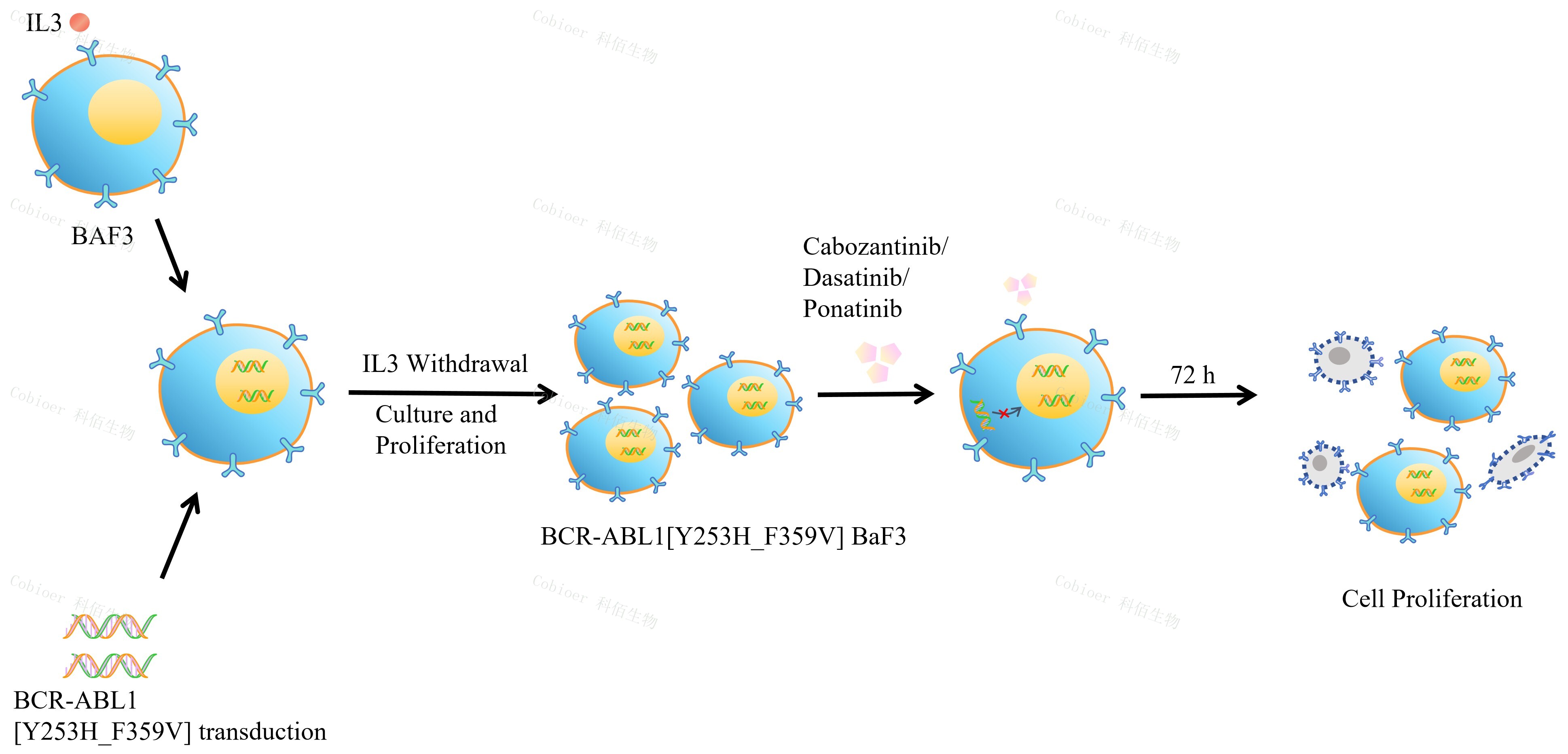 | BCR-ABL1[Y253H_F359V] BaF3 藥靶細胞,通過轉(zhuǎn)導突變狀態(tài)的 BCR- ABL1[Y253H_F359V] 基因到 BaF3 細胞系中, 穩(wěn)定表達人突變形態(tài)下的 BCR- ABL1[Y253H_F359V]基因。 BaF3(小鼠原 B 細胞)的生長和增殖需要 IL-3 的維持。通過引入各種表達激酶的基因, 能作為 BaF3 的驅(qū)動基因,讓 BaF3 不再依賴 IL-3 而增殖,進而激酶基因成為 BaF3 增殖依賴的驅(qū)動基因,用于評估小分子藥物對激酶的靶向抑制作用,原理及流程見下圖所示。 ![]() Figure 1. BCR-ABL1[Y253H_F359V] BaF3 細胞的構建原理圖 |