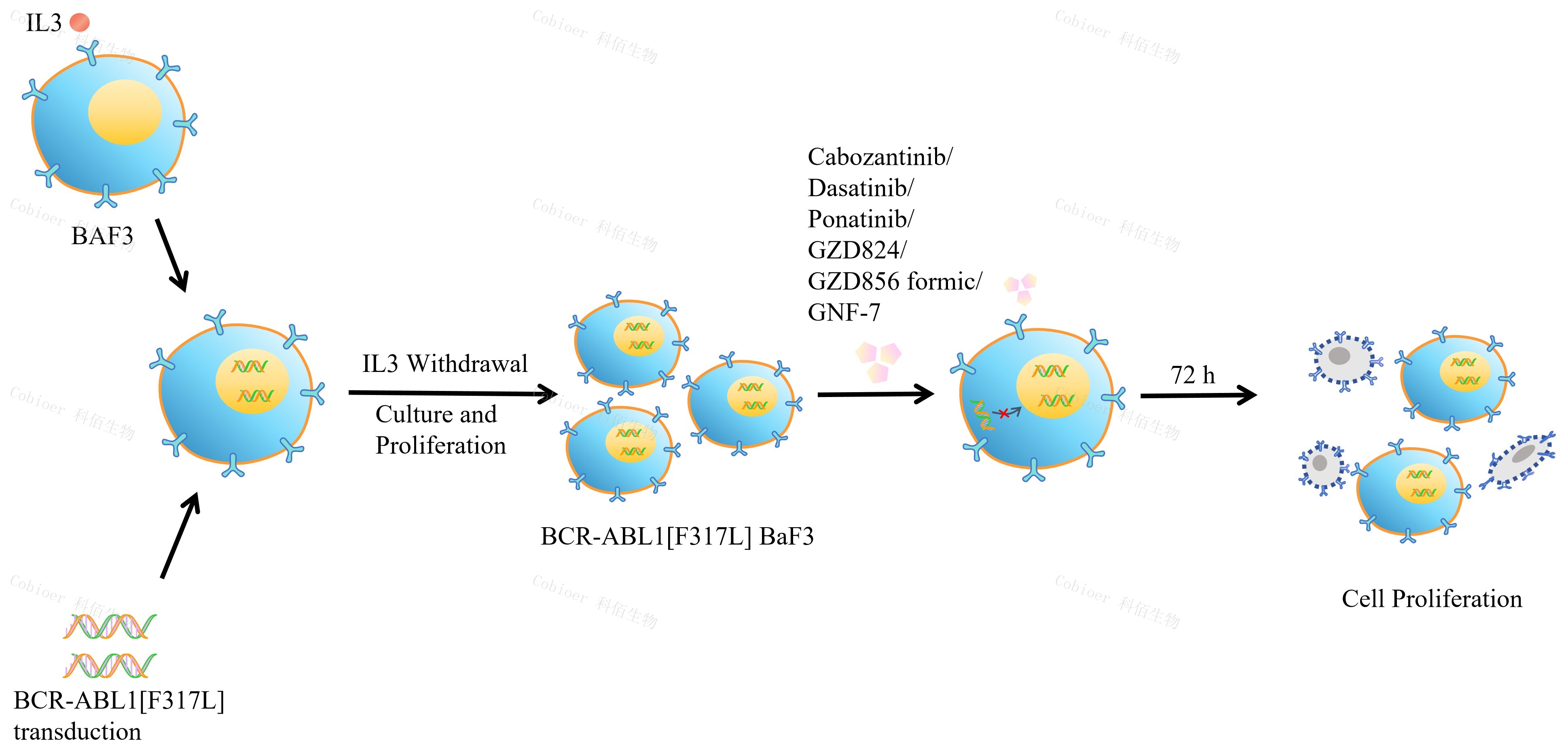 | BCR-ABL1[F317L] BaF3 藥靶細(xì)胞 , 通過轉(zhuǎn)導(dǎo)突變狀態(tài)的 BCR- ABL1[F317L]基因到 BaF3 細(xì)胞系中,穩(wěn)定表達(dá)人突變形態(tài)下的 BCR-ABL1[F317L]基因。 BaF3(小鼠原 B 細(xì)胞)的生長和增殖需要 IL-3 的維持。通過引入各種表達(dá)激酶的基因, 能作為 BaF3 的驅(qū)動(dòng)基因,讓 BaF3 不再依賴 IL-3 而增殖,進(jìn)而激酶基因成為 BaF3 增殖依賴的驅(qū)動(dòng)基因,用于評估小分子藥物對激酶的靶向抑制作用,原理及流程見下圖所示。 ![]() Figure 1. BCR-ABL1[F317L] BaF3 細(xì)胞的構(gòu)建原理圖 |