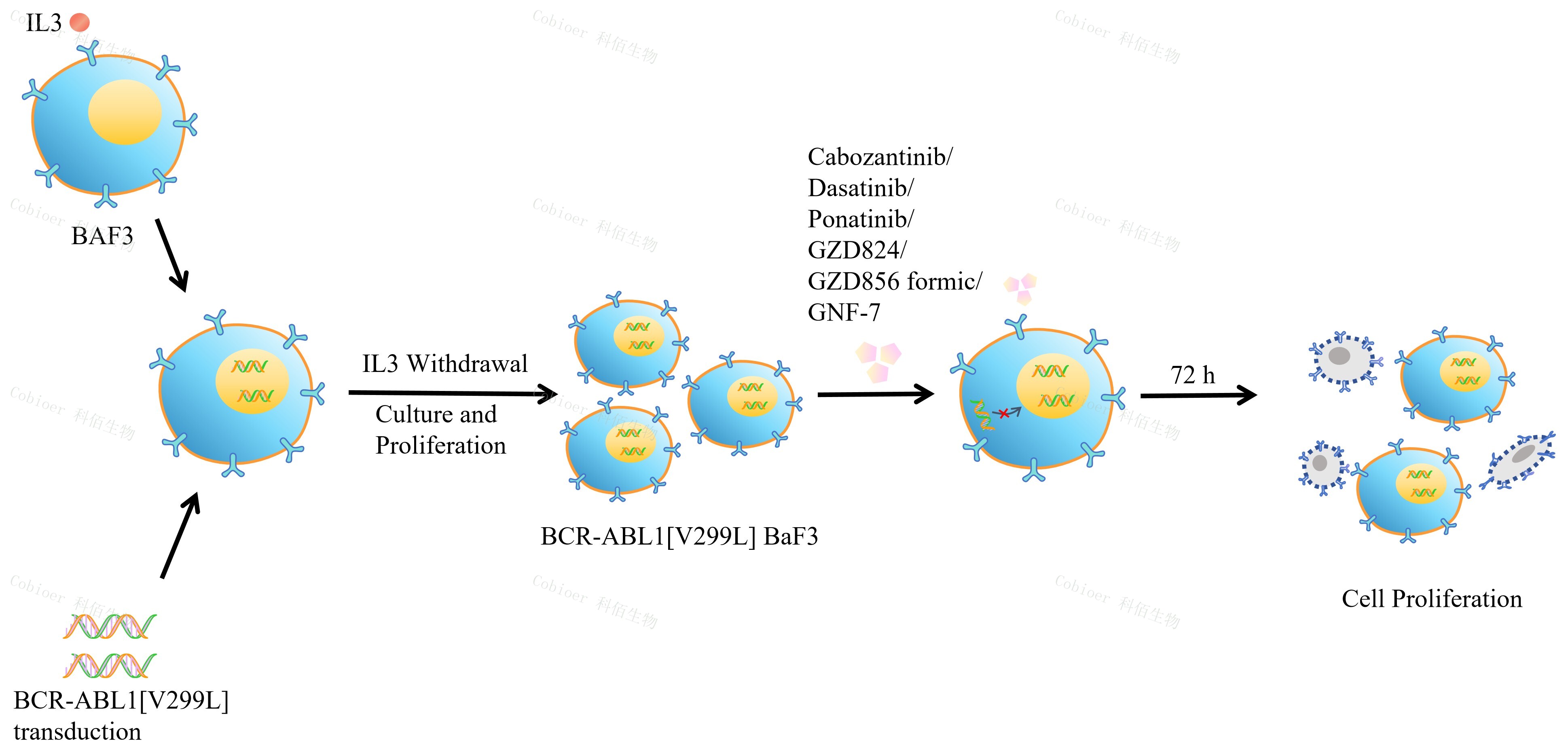 | BCR-ABL1[V299L] BaF3 藥靶細胞 , 通過轉(zhuǎn)導(dǎo)突變狀態(tài)的 BCR- ABL1[V299L]基因到 BaF3 細胞系中,穩(wěn)定表達人突變形態(tài)下的 BCR-ABL1[V299L]基因。 BaF3(小鼠原 B 細胞)的生長和增殖需要 IL-3 的維持。通過引入各種表達激酶的基因, 能作為 BaF3 的驅(qū)動基因,讓 BaF3 不再依賴 IL-3 而增殖,進而激酶基因成為 BaF3 增殖依賴的驅(qū)動基因,用于評估小分子藥物對激酶的靶向抑制作用,原理及流程見下圖所示。 ![]() Figure 1. BCR-ABL1[V299L] BaF3 細胞的構(gòu)建原理圖 |