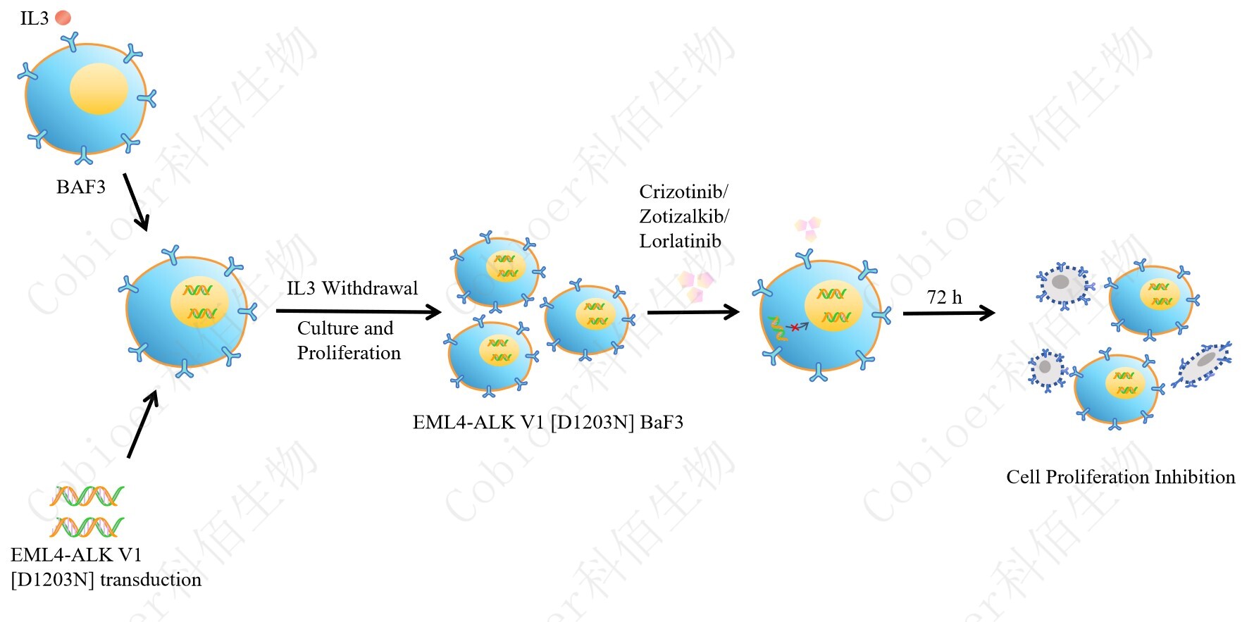 BaF3(小鼠原 B 細胞)的生長和增殖需要 IL-3 的維持。通過引入各種表達激酶的基因, 能作為 BaF3 的驅(qū)動基因,讓 BaF3 不再依賴 IL-3 而增殖,進而激酶基因成為 BaF3 增殖依 賴的驅(qū)動基因,用于評估小分子藥物對激酶的靶向抑制作用,原理及流程見下圖所示。
