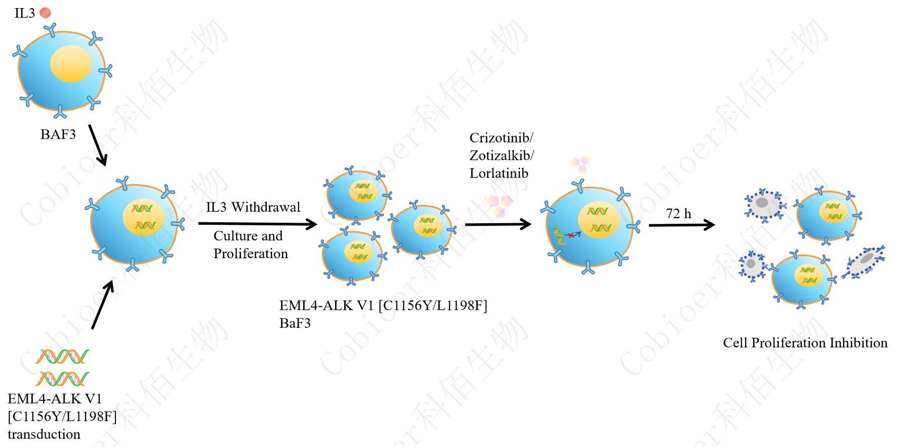 BaF3(小鼠原 B 細(xì)胞)的生長和增殖需要 IL-3 的維持。通過引入各種表達(dá)激酶的基因, 能作為 BaF3 的驅(qū)動(dòng)基因,讓 BaF3 不再依賴 IL-3 而增殖,進(jìn)而激酶基因成為 BaF3 增殖依 賴的驅(qū)動(dòng)基因,用于評(píng)估小分子藥物對(duì)激酶的靶向抑制作用,原理及流程見下圖所示。