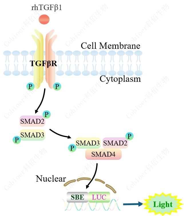 SBE-Luc HEK293 報(bào)告基因細(xì)胞,是由 SBE 調(diào)控并表達(dá) Luc 熒光素酶報(bào) 告基因的 HEK293 細(xì)胞。TGF-β與受體結(jié)合,激活 SBE 的原理見下圖所示。![]() Figure 1. SRE-Luc HEK293 細(xì)胞模型原理圖 |