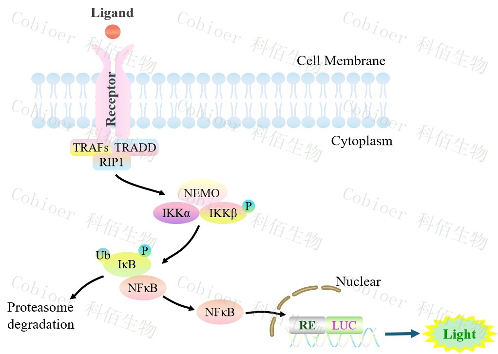 NFκB-Luc HEK293 報告基因細胞,是由 NFκB 調控并表達 Luc 熒光素酶 報告基因的 HEK293 細胞。配體與受體結合后,激活 NF-κB 的原理見下圖所示。