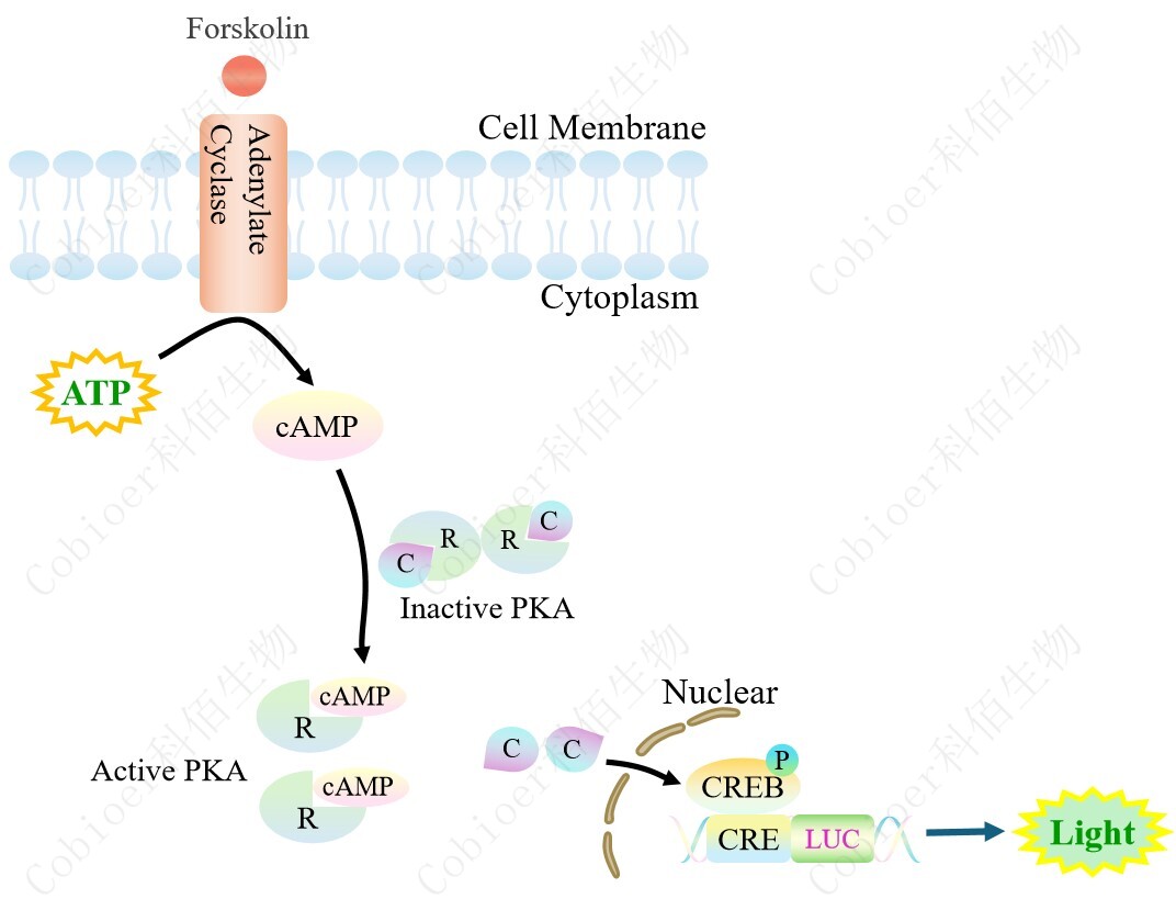 CRE-Luc HEK293 報(bào)告基因細(xì)胞是由 CRE 調(diào)控并表達(dá) Luc 熒光素酶報(bào)告基因的 HEK293 細(xì)胞。Forskolin 是天然存在的直接腺苷酸環(huán)化酶(AC)/cAMP/CREB 的 激活劑,原理見(jiàn)下圖所示。![]() Figure 1:CRE-Luc HEK293 原理示意圖 |