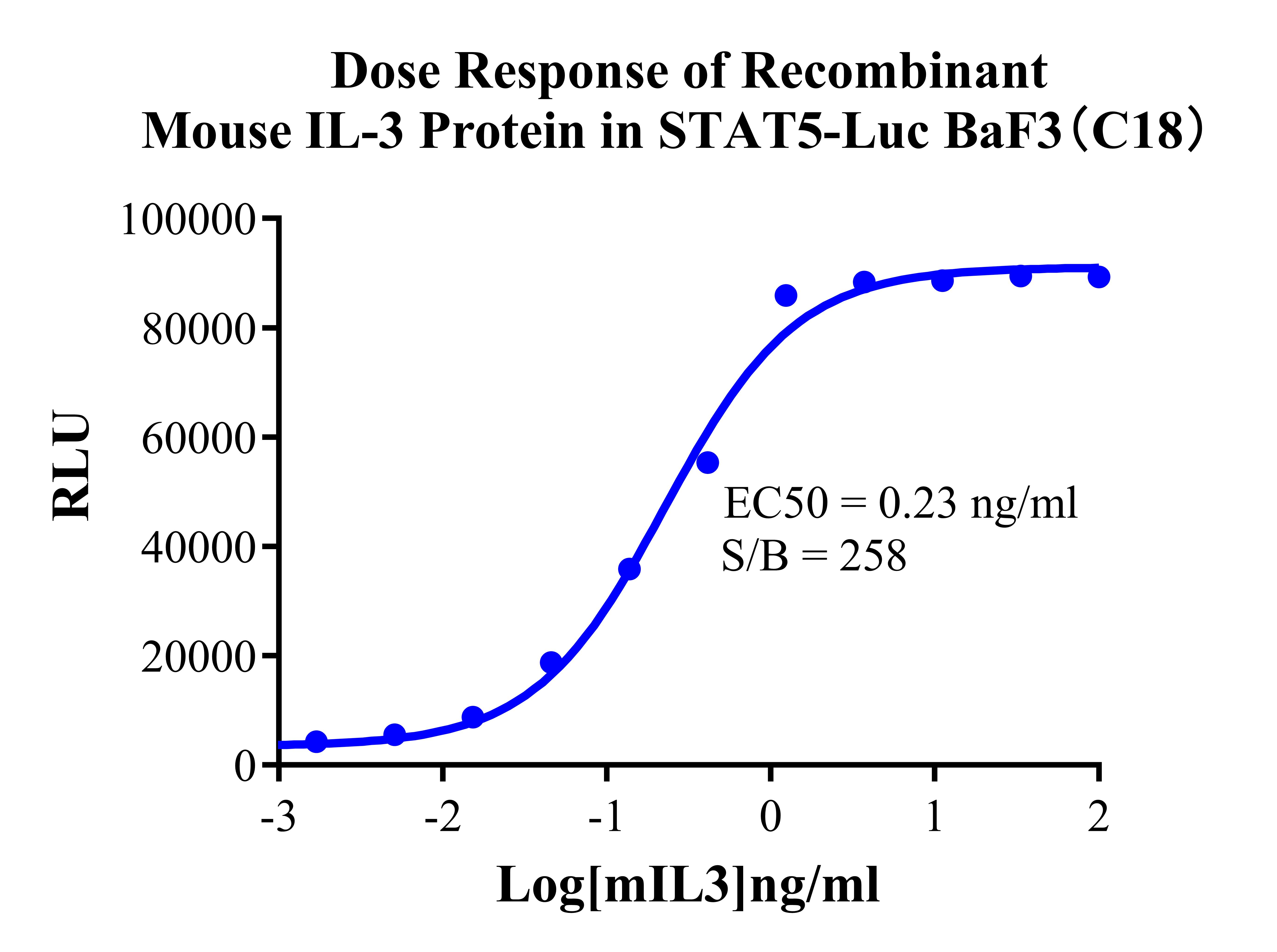 Figure 2.Detect Luciferase assay by Ultra Luciferase Detection Kit CBPH0001(we strongly suggest to purchase from Cobioer). Dose Response of Recombinant Mouse IL-3 Protein in STAT5-Luc BaF3(C18). |