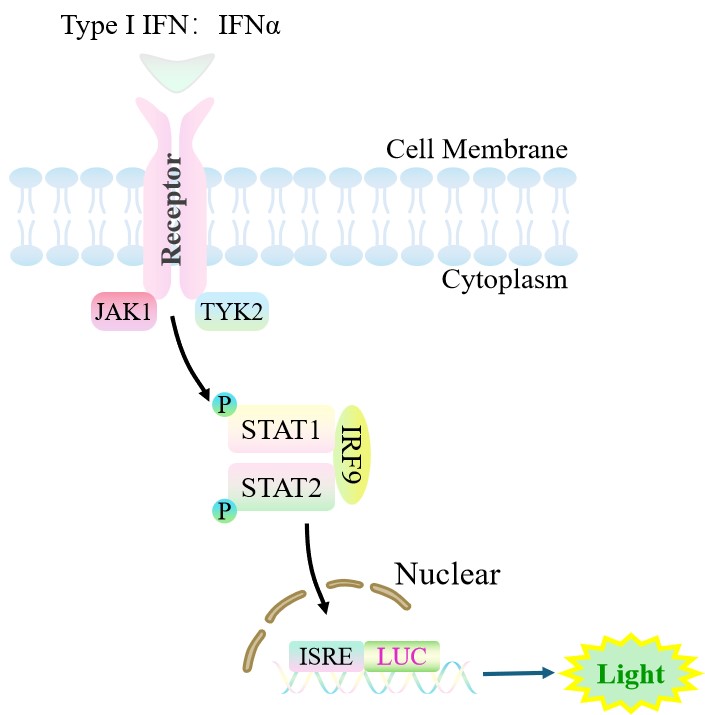 ISRE-Luc HEK293 報告基因細(xì)胞是由 ISRE 調(diào)控并表達(dá) Luc 熒光素酶報告基因的 HEK293 細(xì)胞。IFN 與受體結(jié)合,激活 ISRE 的原理見下圖所示。