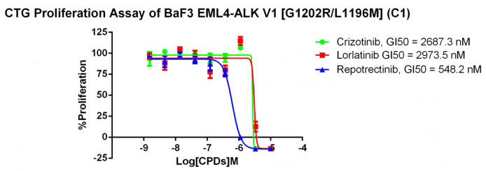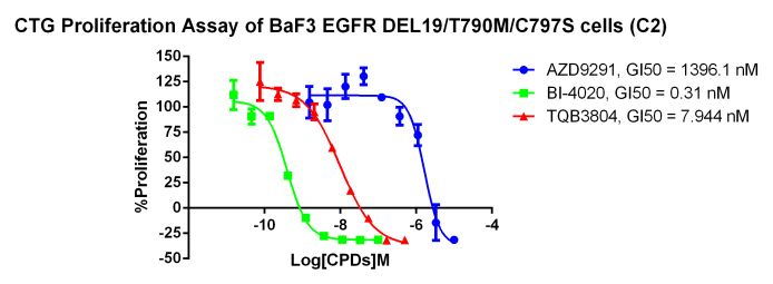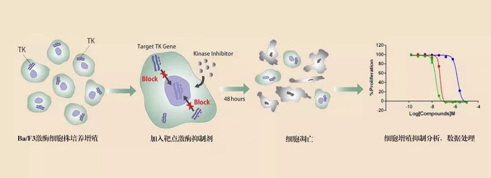 我們結合自己多年在細胞領域的豐富經驗,在 Ba/F3(小鼠原B細胞)上進行改造,引入相應表達激酶基因,這些基因能作為Ba/F3的驅動基因,讓Ba/F3不再依賴IL-3而增殖,進而激酶基因成為Ba/F3增殖依賴的驅動基因,用于評估小分子藥物對激酶的靶向抑制作用。