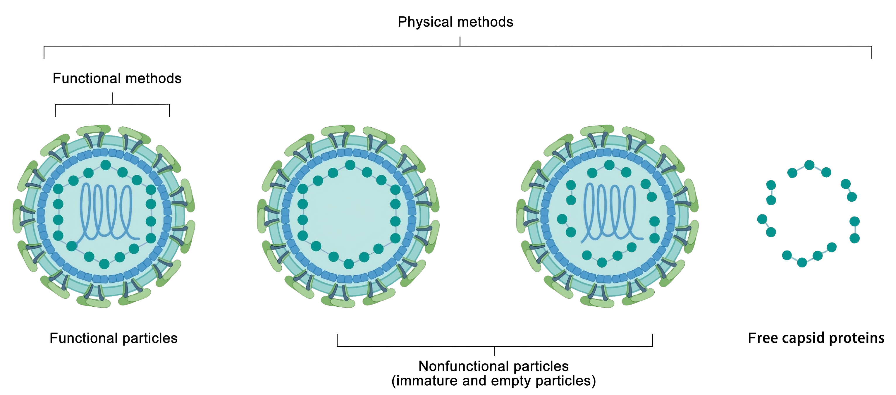 圖7 慢病毒包裝上清液中存在的產(chǎn)物。物理方法可以測量上清液中釋放的功能性和非功能性顆粒,以及游離衣殼蛋白(例如 p24)。功能性滴定方法專門測量功能性病毒顆粒。