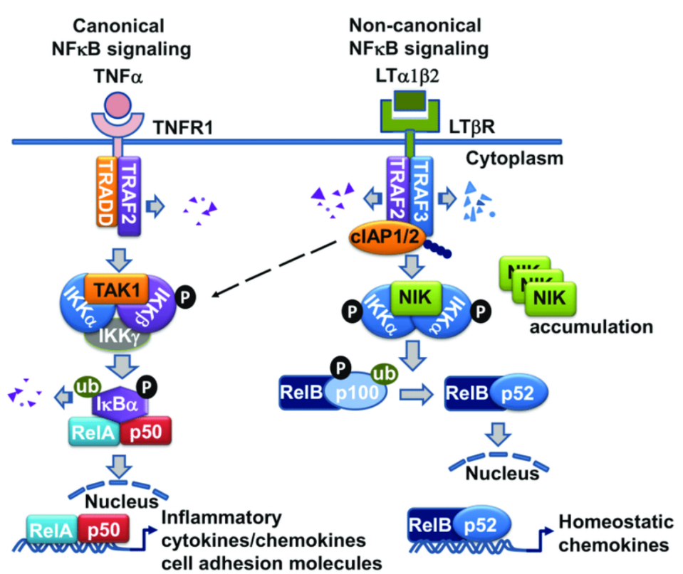 LTBR 信號(hào)傳導(dǎo)具有多效性功能,包括控制淋巴器官發(fā)育、由于維持完整的淋巴結(jié)構(gòu)而支持針對(duì)病原體的有效免疫反應(yīng)、誘導(dǎo)三級(jí)淋巴結(jié)構(gòu)(LTS)、肝臟再生或控制脂質(zhì)穩(wěn)態(tài)。通過LTBR 的信號(hào)傳導(dǎo)包括非經(jīng)典/經(jīng)典NF-κB 途徑,從而誘導(dǎo)趨化因子、細(xì)胞因子或粘附分子表達(dá)、細(xì)胞增殖和細(xì)胞存活。LTα1β2與LTβR的結(jié)合啟動(dòng)TRAF2和TRAF3向LTβR復(fù)合物募集,其中TRAF2和TRAF3被cIAP1/2降解,導(dǎo)致NF-κ b誘導(dǎo)激酶(NIK)的穩(wěn)定和積累。NIK與IKKα復(fù)合物被激活并導(dǎo)致同二聚體IKKα磷酸化。最終,與RelB結(jié)合的p100前體被切割成p52,并導(dǎo)致RelB-p52異二聚體復(fù)合體易位到細(xì)胞核,啟動(dòng)趨化因子基因轉(zhuǎn)錄。LTβR連接還激活I(lǐng)KKα/β磷酸化和RelA/p50核易位,從而導(dǎo)致炎癥和細(xì)胞粘附分子的基因轉(zhuǎn)錄。