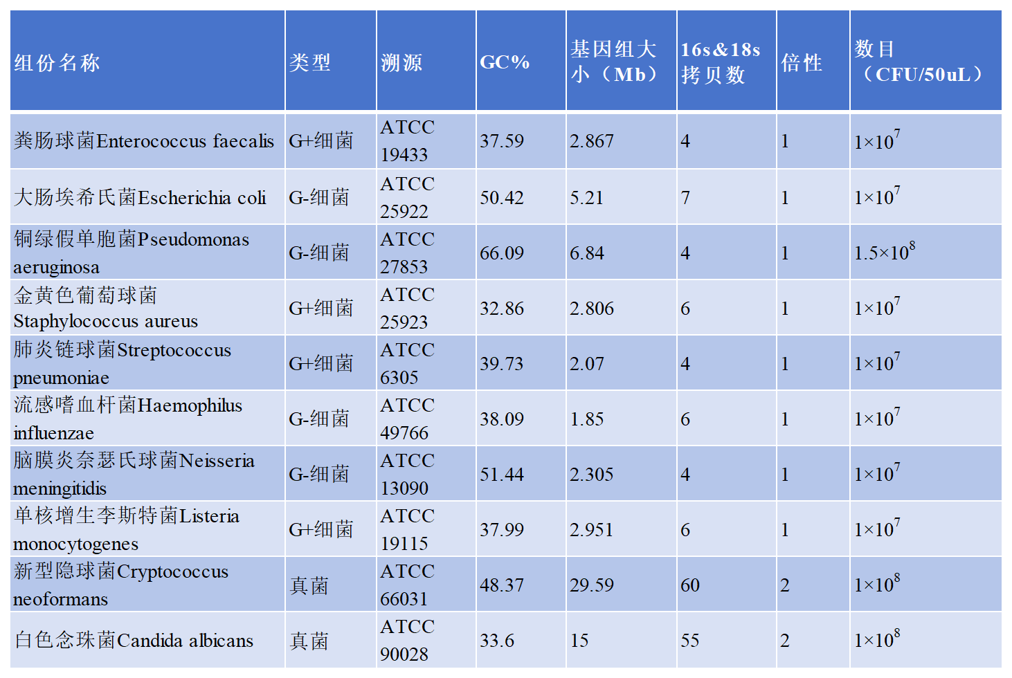 科佰生物新推出了多重病原菌質控品,選擇具有代表性的病原組成見下表。以上病原均可溯源,各病原基因組數據科佰可提供。