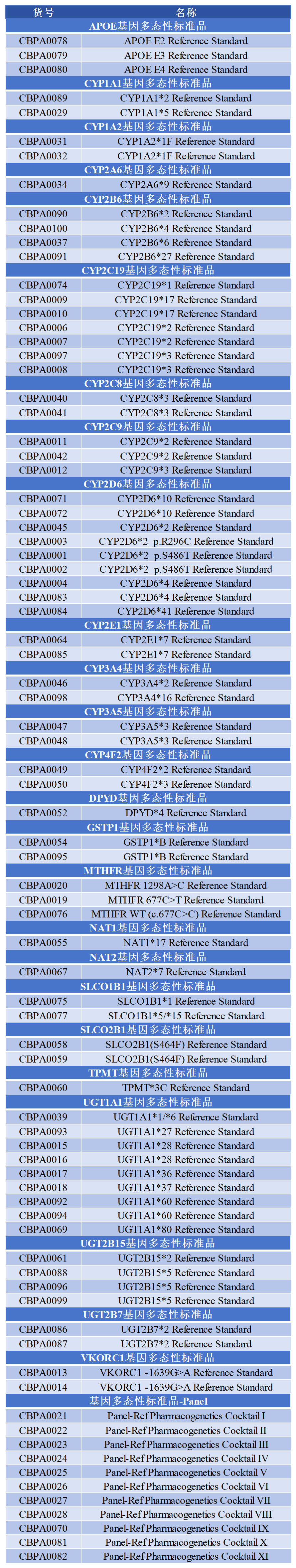 科佰生物目前可提供近百種用藥指導(dǎo)的質(zhì)控單品及混合質(zhì)控盤,涵蓋APOE、CYP1A1、CYP2A6、CYP2B6、CYP2C19、CYP2C8、CYP2C9、CYCP2D6、CYP2E1、CYP3A4、CYP3A5、CYP4F2、DPYD、GSTP1、MTHFR、NAT1、NAT2、SLCO1B1、TPMT、UGT1A1、UGT2B15、UGT2B7、VKORC1等多個藥物代謝基因,可在全流程對檢測過程進(jìn)行監(jiān)控,幫助實現(xiàn)個體化用藥基因檢測的精準(zhǔn)性。