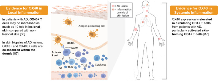 有研究證明OX40通路的激活參與了AD患者的全身和局部炎癥(如下圖所示)。雖然OX40L的表達(dá)(主要是單核細(xì)胞)在AD患者和健康對照組之間沒有差異,但在AD患者循環(huán)CD4+ T細(xì)胞中OX40的表達(dá)升高。在AD患者的外周血中,活化的CD4+ T細(xì)胞上OX40的表達(dá)比未表達(dá)抗原的活化CD4+ T細(xì)胞上OX40的表達(dá)增加。AD患者病變皮膚中OX40+細(xì)胞(可能是T細(xì)胞)和OX40L+樹突狀細(xì)胞的數(shù)量比銀屑病和非病變皮膚多。一項(xiàng)研究表明,在AD患者中,皮損皮膚中OX40+ T細(xì)胞比非皮損皮膚增加了10倍之多。在AD病變的皮膚活檢中,發(fā)現(xiàn)OX40+真皮細(xì)胞和OX40L+細(xì)胞(可能是肥大細(xì)胞)在真皮內(nèi)共定位,在角質(zhì)形成細(xì)胞上可見OX40L的表達(dá),提示OX40信號的局部活性。