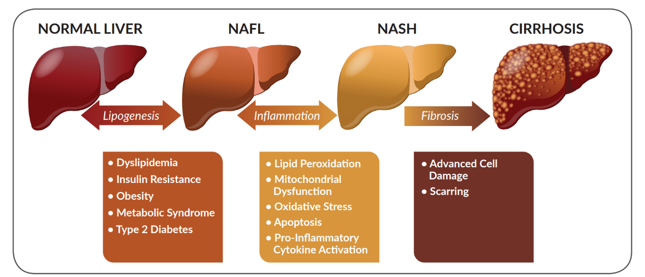 非酒精性脂肪性肝炎(NASH)是非酒精性脂肪肝?。∟AFLD)的嚴重形式,伴隨肝臟炎癥、脂肪堆積和纖維化,可進展為肝硬化甚至肝癌。全球約 25% 成人患有非酒精性脂肪肝?。∟AFLD),其中20%-30% 會進展為非酒精性脂肪性肝炎(NASH)。