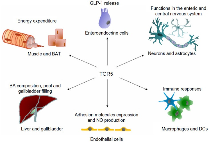 TGR5在多種細(xì)胞類型中被研究,如肌肉細(xì)胞、脂肪細(xì)胞、內(nèi)皮細(xì)胞(ECs)和巨噬細(xì)胞。TGR5的功能依賴于細(xì)胞類型,從胰高血糖素樣肽-1 (GLP-1)的釋放和線粒體能量穩(wěn)態(tài)到炎癥反應(yīng)的控制。