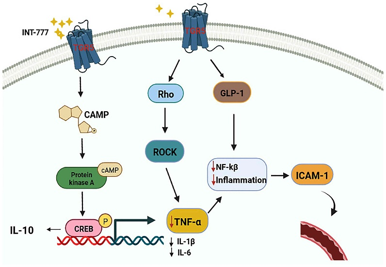 有報(bào)道稱,在慢性炎癥反應(yīng)中,TNF-α可激活多種半胱天冬酶,導(dǎo)致炎癥細(xì)胞凋亡。TGR5已被發(fā)現(xiàn)通過調(diào)節(jié)Rho/Rho相關(guān)蛋白激酶(ROCK)信號(hào)通路來調(diào)節(jié)TNF-α。作為TGR5的激動(dòng)劑,INT-777可以阻斷TNF-α誘導(dǎo)的RMEC增殖和遷移,抑制TNF-α促進(jìn)血管通透性的作用。此外,已有證據(jù)表明,TGR5激動(dòng)劑可以通過激活TGR5- camp蛋白激酶A (PKA)信號(hào)通路,上調(diào)IL-10的表達(dá),發(fā)揮抗炎和免疫抑制作用,降低促炎細(xì)胞因子IL-1β、IL-6和TNF-α的表達(dá)。有研究表明,GLP-1可通過抑制NF-κB延緩ECs的損傷,進(jìn)而抑制IL-1β、IL-6、TNF-α等炎癥因子的分泌。而各種研究證實(shí)GLP-1是TGR5的靶點(diǎn)之一;其分泌依賴于TGR5。因此,推測(cè)激活TGR5可能是刺激GLP-1分泌、延緩RMEC損傷的有效途徑。
