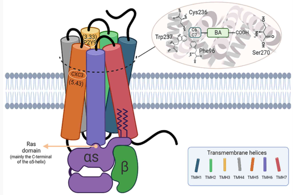TGR5 受體是第一個(gè)已知的膽汁酸特異性G蛋白偶聯(lián)受體,也被稱為膽汁酸受體 1(GPBAR1),屬于 A 類 G 蛋白偶聯(lián)受體(GPCR)亞家族。該受體由七個(gè)跨膜螺旋(TMH1-7)、三個(gè)胞外環(huán)(ECL1-3)組成,有助于配體結(jié)合,以及三個(gè)胞內(nèi)環(huán)(ICL1-3),參與將信號(hào)傳遞給下游信號(hào)分子。
