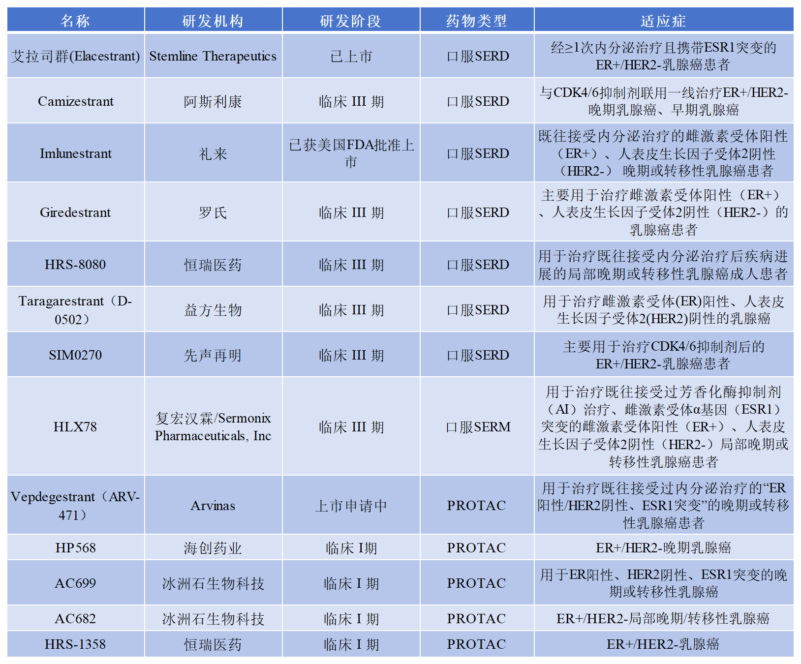 從他莫昔芬、芳香化酶抑制劑到氟維司群,傳統療法逐漸暴露出耐藥性、注射給藥不便等局限性。新一代口服選擇性雌激素受體降解劑(SERD)以創(chuàng)新作用機制和口服優(yōu)勢,有望重塑HR+/HER2-乳腺癌的治療格局。另外,還有降解 ER的PROTAC等藥物在研發(fā)中。以下為部分已上市或處于臨床階段的藥物信息: