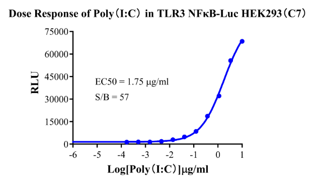 Figure4. Detect Luciferase assay by Ultra Luciferase Detection Kit CBPH0001(we strongly suggest to purchase from Cobioer). Dose Response of Poly(I:C) in TLR3 NFκB-Luc HEK293(C7).