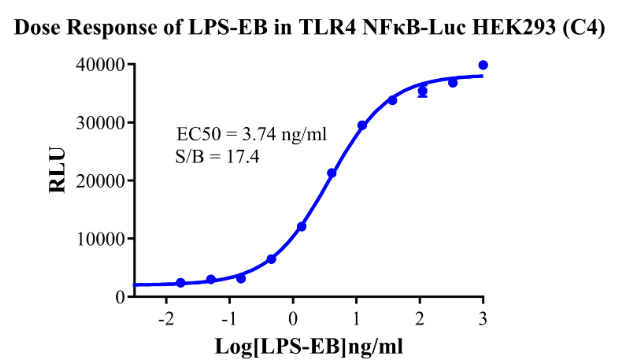 Figure 5.Detect Luciferase assay by Ultra Luciferase Detection Kit CBPH0001(we strongly suggest to purchase from Cobioer). Dose Response of LPS-EB in TLR4 NFκB-Luc HEK293(C4).