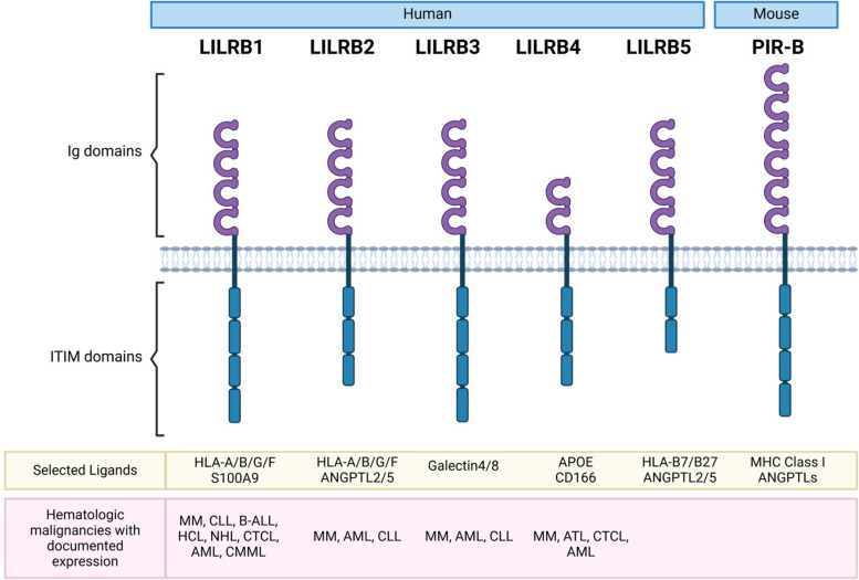 白細(xì)胞免疫球蛋白樣受體亞家族B(LILRB)因在腫瘤微環(huán)境中起到免疫抑制作用,逐漸受到越來越多的關(guān)注。其家族包含5個成員:LILRB1(LIR-1, ILT2, CD85j)、LILRB2(LIR-2, ILT4, CD85d)、LILRB3(LIR-3, ILT5, CD85a)、LILRB4(LIR-5, ILT3, CD85k)、LILRB5(LIR-8, CD85c)。LILRB家族結(jié)構(gòu)及配體如下圖所示: