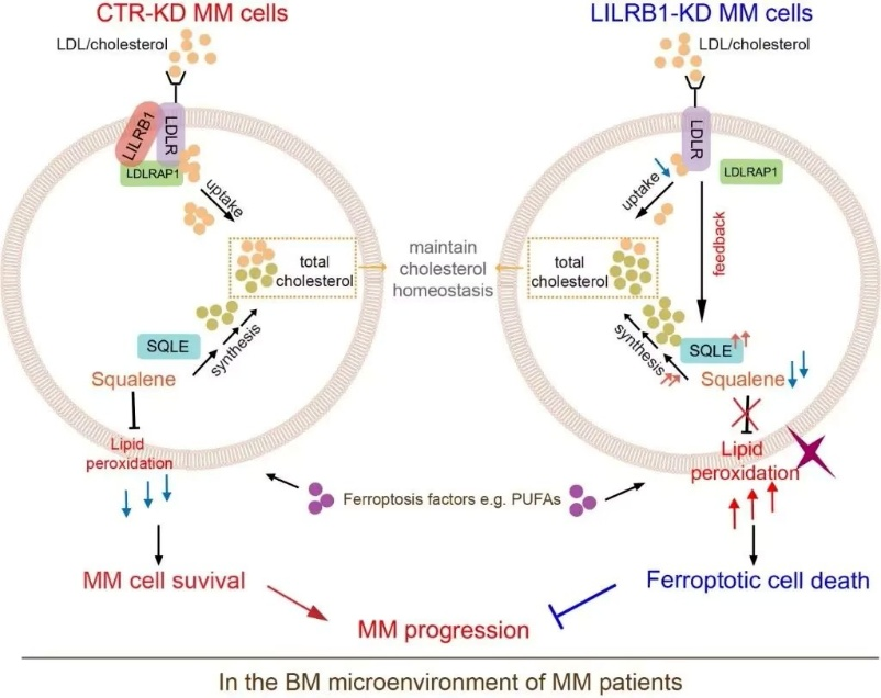 另有文獻揭示在多發(fā)性骨髓瘤(MM:multiple myeloma)細(xì)胞中,膜蛋白LILRB1通過協(xié)助MM細(xì)胞攝取低密度脂蛋白(LDL),維持細(xì)胞內(nèi)膽固醇合成通路中具有抗氧化作用的代謝物角鯊烯(squalene)的含量,從而保護MM細(xì)胞不發(fā)生鐵死亡,促進多發(fā)性骨髓瘤的惡性進展。