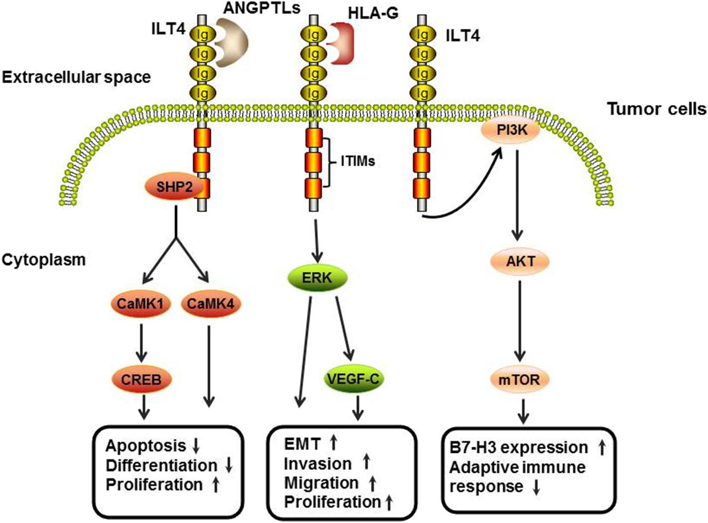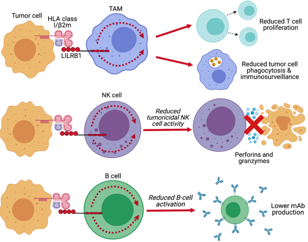 LILRB2主要表達于髓系細(xì)胞(如單核細(xì)胞、巨噬細(xì)胞、樹突狀細(xì)胞)和某些腫瘤細(xì)胞。它通過與配體(如HLA-G、ANGPTLs、SEMA4A和CD1d)結(jié)合,傳遞抑制性信號,抑制免疫細(xì)胞的活性,促進腫瘤免疫逃逸。