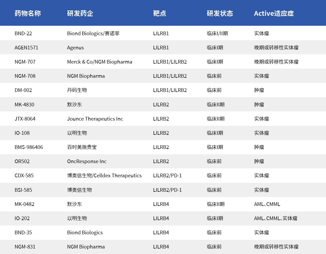 作為免疫檢查點的一員,同時又是腫瘤維持因子,LILRB被認(rèn)為是腫瘤治療具有潛力的靶點,目前部分藥企研發(fā)進展如下: