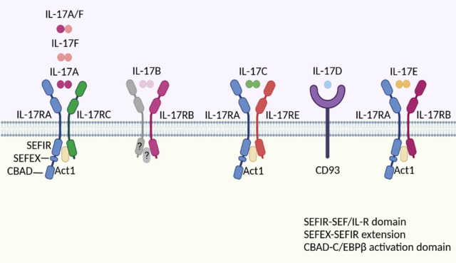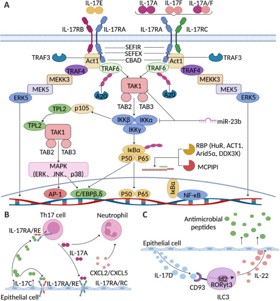 IL-17 細胞因子具有一個半胱氨酸環(huán)結(jié)構(gòu),它們會與特定的 IL-17R 受體結(jié)合,通過 SEFIR、SEFEX 和 CBAD 結(jié)構(gòu)域激活免疫信號傳導(dǎo)。IL-17 信號傳導(dǎo)始于 IL-17A/A、IL-17A/F 或 IL-17F/F 細胞因子與其受體(IL-17RA 和 IL-17RC)的結(jié)合,或者 IL-17E/E 細胞因子與其受體(IL-17RA 和 IL-17RB)的結(jié)合。當配體結(jié)合后,Act1 會激活多種獨立的信號傳導(dǎo)途徑,這些途徑通過不同的 TRAF 蛋白介導(dǎo)。TRAF6 的激活會導(dǎo)致 NF-κB、C/EBPβ、C/EBPδ 和 MAPK 信號通路的觸發(fā)。IL-17R-Act1 復(fù)合物還通過 TRAF4 與 MEKK3 和 MEK5 結(jié)合,從而激活 ERK5。不同類別的抑制劑,如泛素酶(TRAF3)、去泛素酶(A20)、RBP(HuR、ACT1、Aridα 和 DDX3X)、內(nèi)切核糖核酸酶(MCPIP1/Regnase-1)和微小 RNA(miR-23b),通過各種獨立的機制負向調(diào)節(jié) IL-17 信號傳導(dǎo)。IL-17C 主要由上皮細胞表達。當 IL-17RA/RE 受體復(fù)合物表達時,上皮細胞本身和 TH17 細胞都是 IL-17C 的作用靶點。除了增加 Th17 細胞中 IL17A 的表達外,IL-17C 還通過間接方式增強吸引中性粒細胞的趨化因子在上皮細胞中的表達,最終導(dǎo)致強烈的炎癥反應(yīng)。