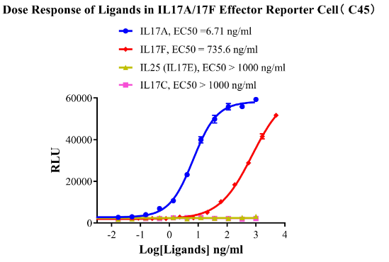 為了助力IL17相關(guān)靶點藥物的研發(fā),科佰生物分別開發(fā)了針對IL17A/F和IL25的細胞模型,用于候選藥物早期機理研究。部分結(jié)果如下:
