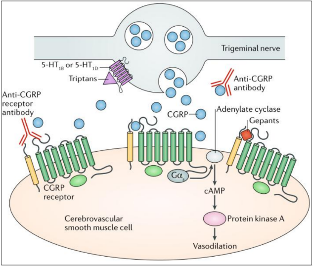 降鈣素基因相關(guān)肽(calcitonin gene-related peptid,CGRP)是一個含有37個氨基酸殘基的感覺神經(jīng)源性多肽,分為α-CGRP和β-CGRP兩個亞型,廣泛分布于中樞神經(jīng)系統(tǒng)(主要是三叉神經(jīng)血管系統(tǒng)、丘腦和小腦)。CGRP是一種強效的血管擴張劑,它主要由感覺神經(jīng)(如三叉神經(jīng))釋放。CGRP釋放后與腦血管平滑肌細胞表面的CGRP受體結(jié)合,引起腦血管擴張。CGRP受體的結(jié)構(gòu)主要包括:降鈣素受體樣受體(CALCRL)、活性修飾蛋白受體(RAMP)及結(jié)構(gòu)蛋白受體(RCP)。CGRP受體復(fù)合物是一種G蛋白偶聯(lián)受體,通過激活蛋白激酶A系統(tǒng),參與疼痛信息的病理調(diào)控過程。