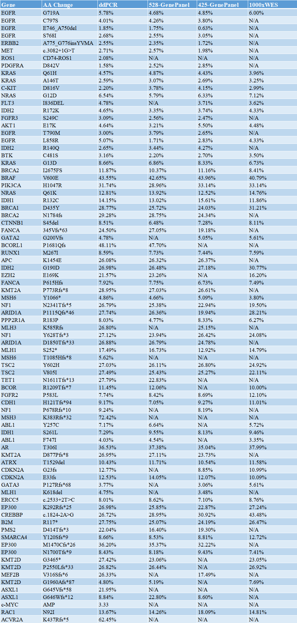 3.定標(biāo)方案更科學(xué):采取4種方法定標(biāo),分別是1000xWES,3000x 425 Gene-Panel(友商-組織樣本),3000x 528 Gene-Panel(內(nèi)部開發(fā)探針捕獲法),82位點(diǎn)的ddPCR(3復(fù)孔);