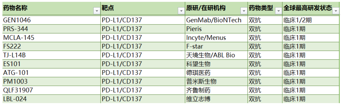 由于4-1BB在高度耗竭的PD-1高表達CD8+TIL上顯著表達,并且在PD-1阻斷后進一步上調,而4-1BB信號傳導則會誘導CD8+TIL的克隆擴增,CD8+TIL表現(xiàn)出腫瘤反應性而無終末分化,因此4-1BB和PD-L1可能是誘導T細胞抗腫瘤反應機制上的一對好搭檔。針對這兩者開發(fā)雙特異性抗體是一種極具前景的開發(fā)策略,引得國內外玩家紛紛參與,目前已有十余款針對PD-L1/4-1BB的雙抗藥物處于不同的研發(fā)介段,下表列舉了部分已進入臨床的雙抗藥物: