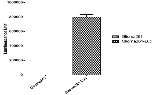 Figure 3. Detect Luciferase assay by Promega Bright-Glo Luciferase Assay System.The number of Luminescence signal is 437±18(Mean±SD) on Glioma261 cells while 787640±28790(Mean±SD) on Glioma261-Luc cells.