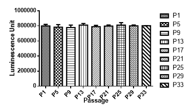 Figure 4. Stablity test results. Glioma261-Luc cells showed at least 32 passage stability with similar luminescence unit.