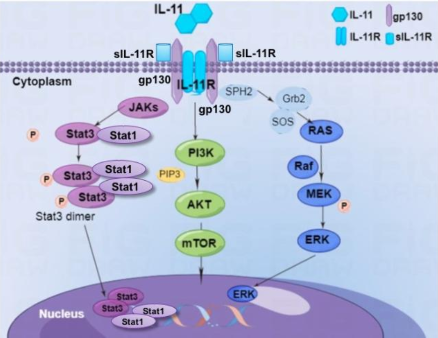 JAK/STAT信號(hào)通路是IL-11最廣為人知的下游信號(hào)通路。IL-11信號(hào)轉(zhuǎn)導(dǎo)涉及GP130,由STAT3的激活和相對(duì)低水平的STAT1介導(dǎo)。在IL-11與其受體結(jié)合后,JAK與適配蛋白形成復(fù)合物。STATs隨后被酪氨酸磷酸化,導(dǎo)致其二聚化并與受體復(fù)合物分離?;罨腏AK激酶可導(dǎo)致酪氨酸磷酸化和STAT家族轉(zhuǎn)錄因子的刺激。IL-11可誘導(dǎo)酪氨酸磷酸化STAT3和STAT1,但后者在較高濃度下以劑量依賴性的方式發(fā)生。STAT在特定酪氨酸殘基上被JAK磷酸化,并且STAT同二聚體和異二聚體通過(guò)SH2結(jié)構(gòu)域?qū)印A姿峄腟TATs二聚化,轉(zhuǎn)運(yùn)到細(xì)胞核中,并觸發(fā)靶基因的轉(zhuǎn)錄調(diào)節(jié)。