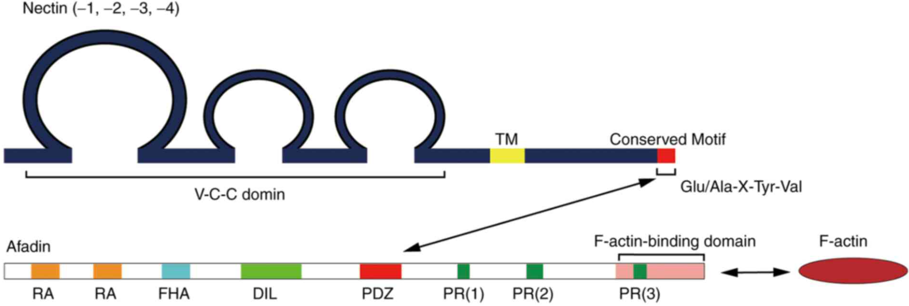 胞質(zhì)尾的C端都包含一個afadin (一種 F-肌動蛋白結(jié)合蛋白)結(jié)合基序,與Nectin-4不同的是,Nectin-1、Nectin-2、Nectin-3的afadin結(jié)合基序都是保守序列 Glu/Ala-X-Tyr-Val,可與 afadin的PDZ 結(jié)構(gòu)域結(jié)合;而Nectin-4可通過其C末端的 Gly-His-Leu-Val 基序與銜接分子afadin結(jié)合。當(dāng)Nectins與銜接分子afadin結(jié)合后,afadin會結(jié)合并募集絲狀肌動蛋白組件 (F-actin),從而促進(jìn)細(xì)胞與細(xì)胞之間的粘附。Nectin家族與鈣黏著蛋白共同作用,對粘著連接和緊密連接的產(chǎn)生和維持具有顯著影響,它們調(diào)節(jié)多種細(xì)胞行為,包括細(xì)胞粘附、生長、分化、遷移和凋亡。